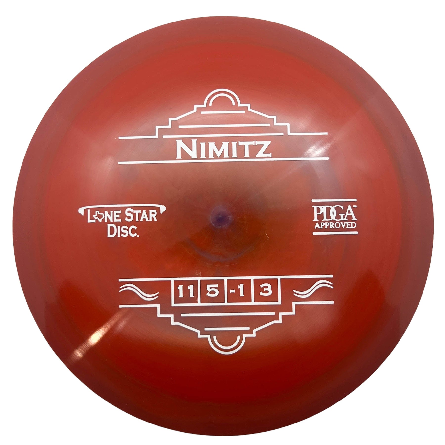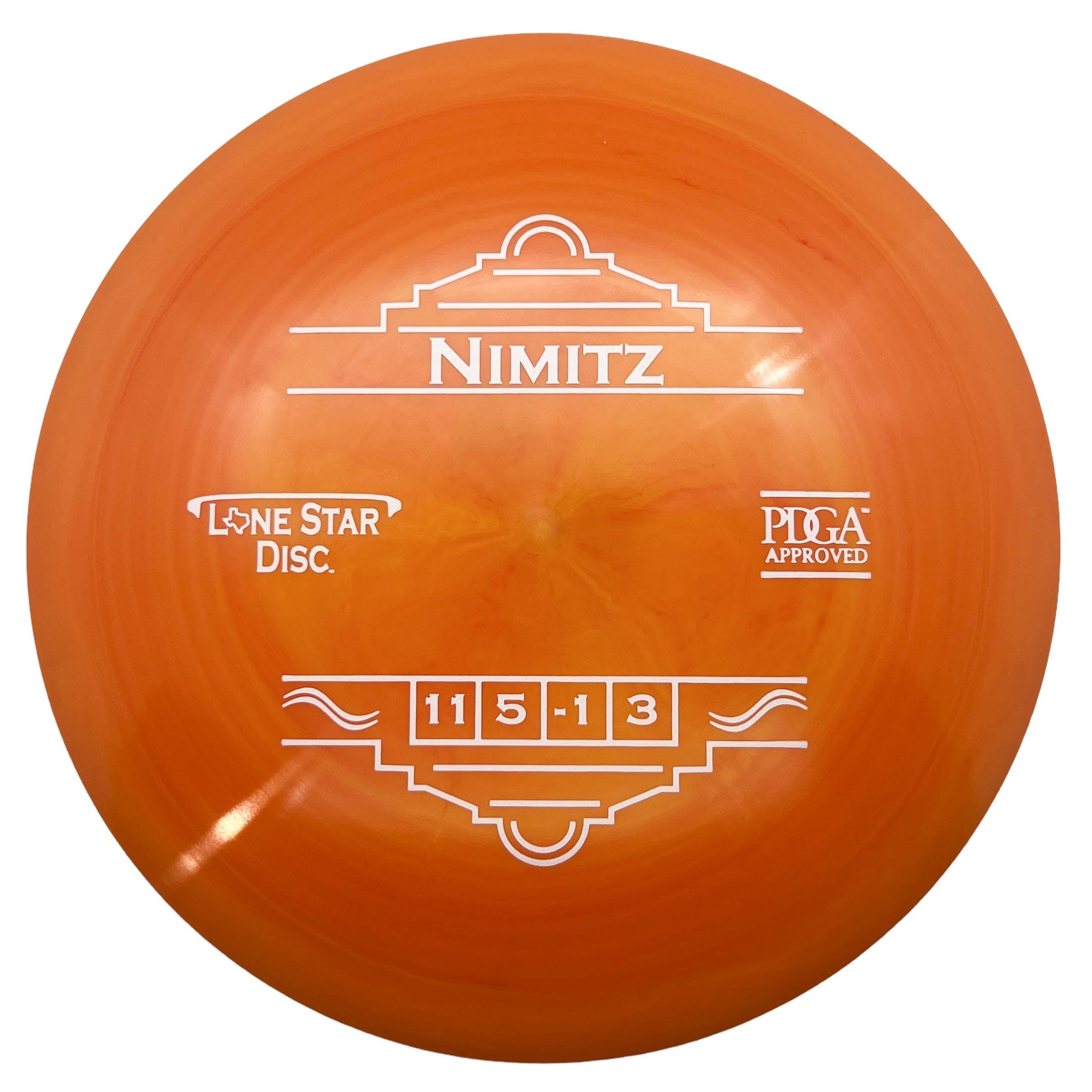 The Lonestar Nimitz is a stable to overstable disc golf driver. Named after the Fredericksburg native Chester Nimitz, the Nimitz is a disc that fits perfectly between the Curl and Warbird. This Distance Driver from Lone Star Disc has a slight turn and finishes with a reliable fade at the end of it's flight. It can handle the power of experienced throwers yet is not too fast for most players.