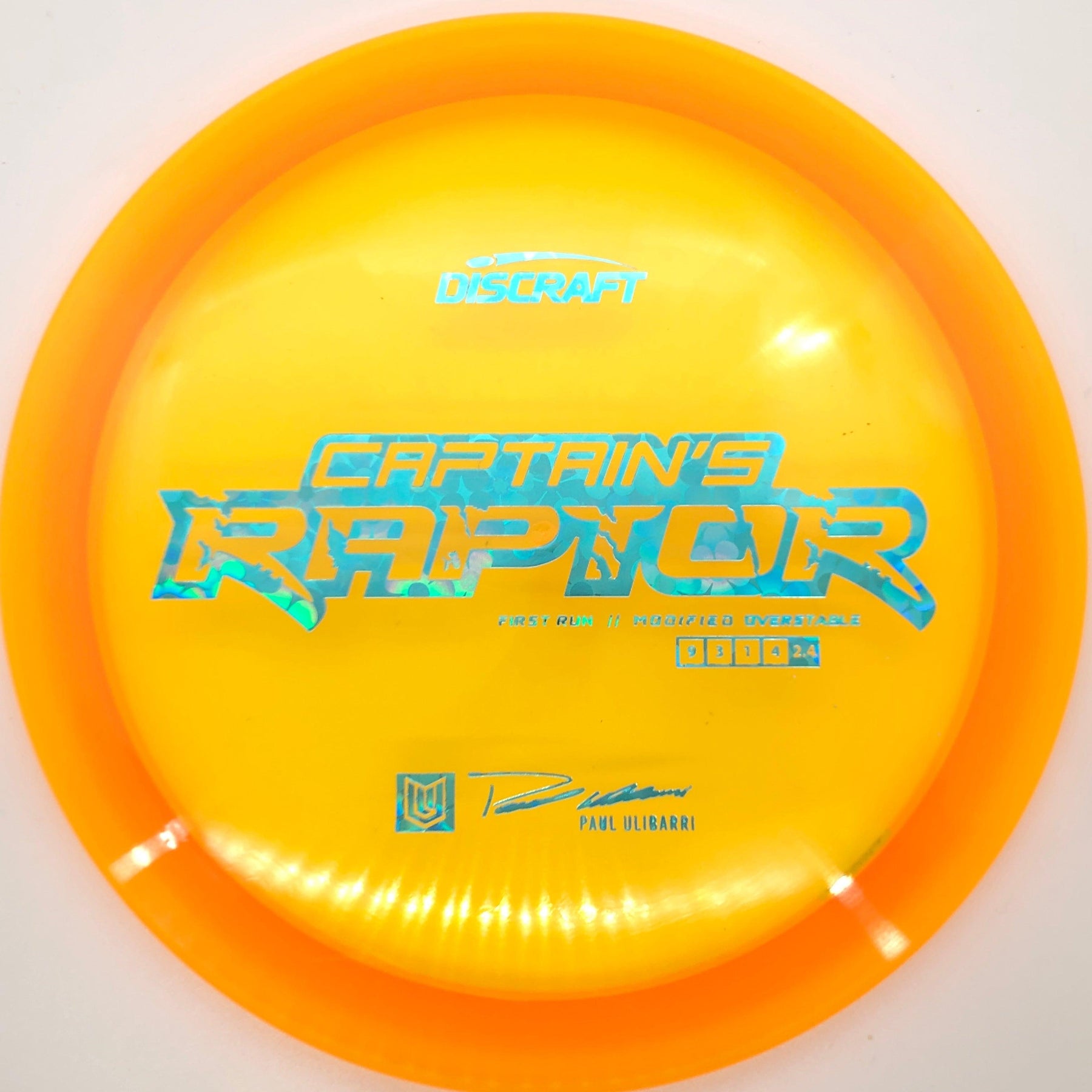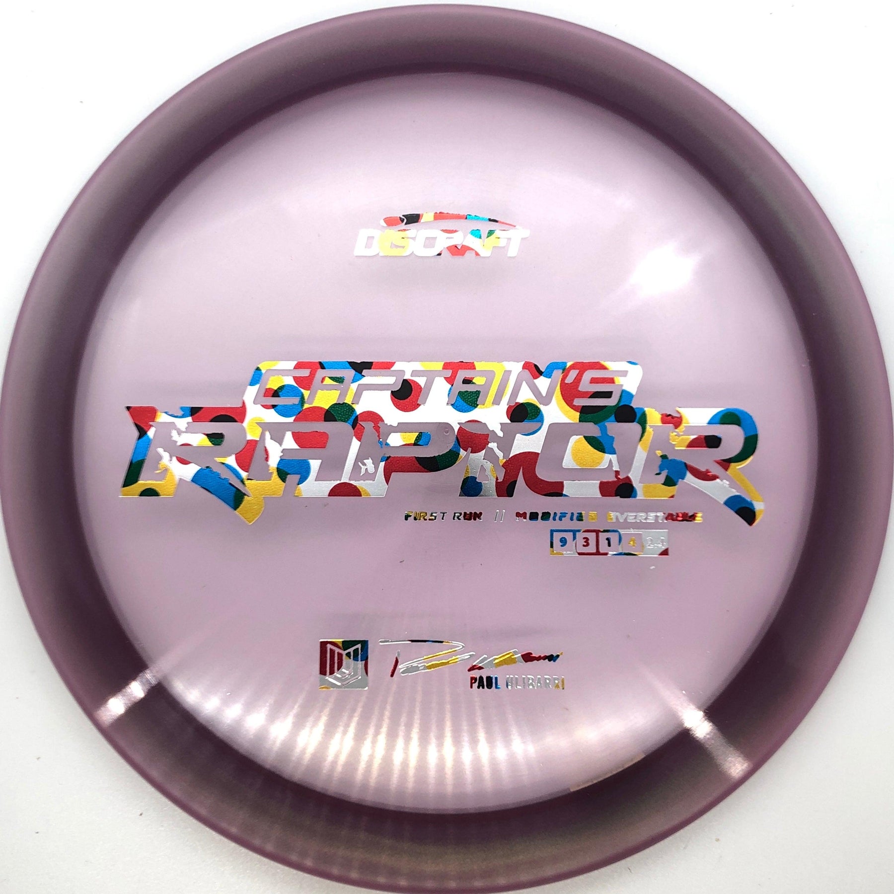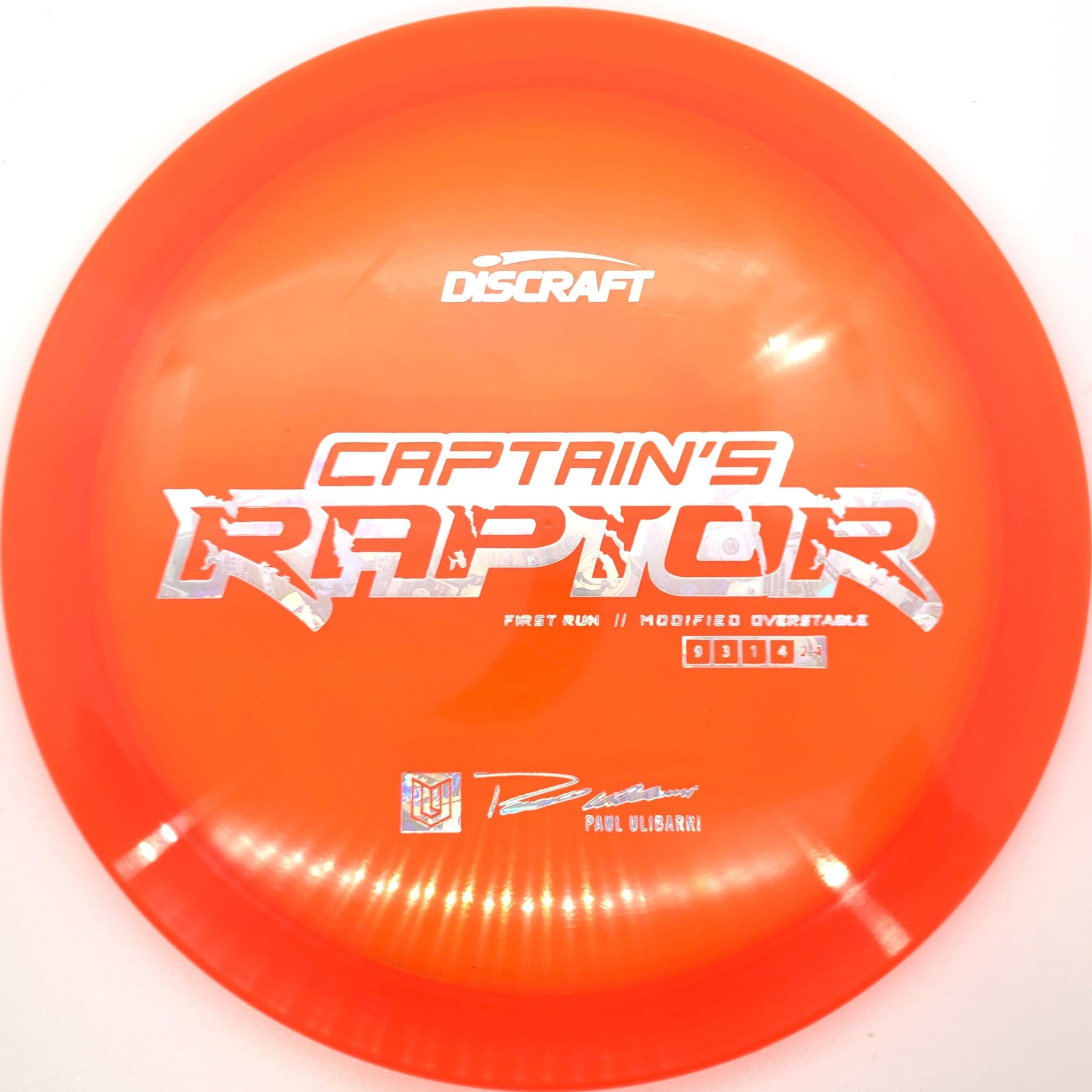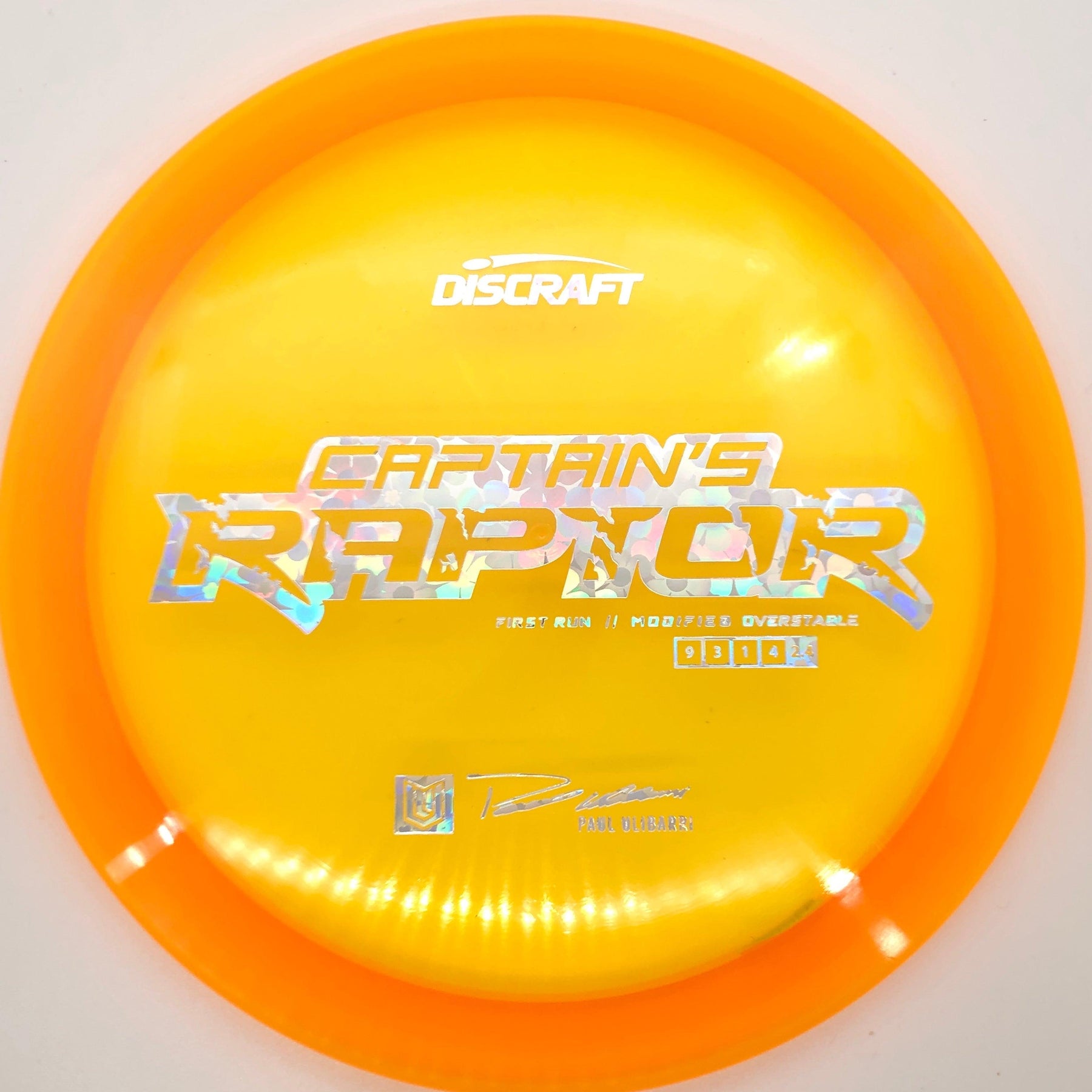 The Captain's Raptor is a modified-overstable Discraft Raptor ran in Special Blend Z plastic. This disc was inspired by Team Discraft Captain, Paul Ulibarri.