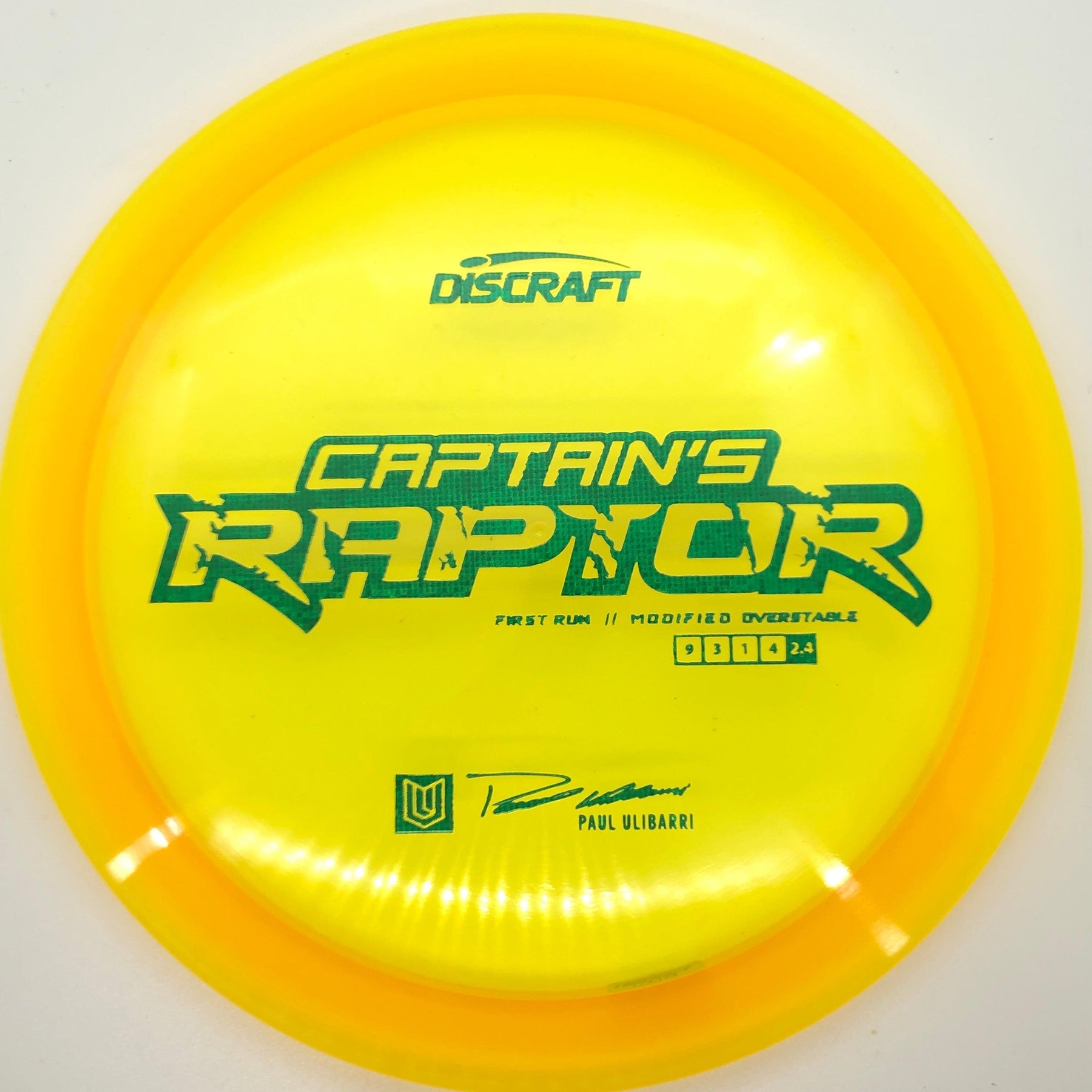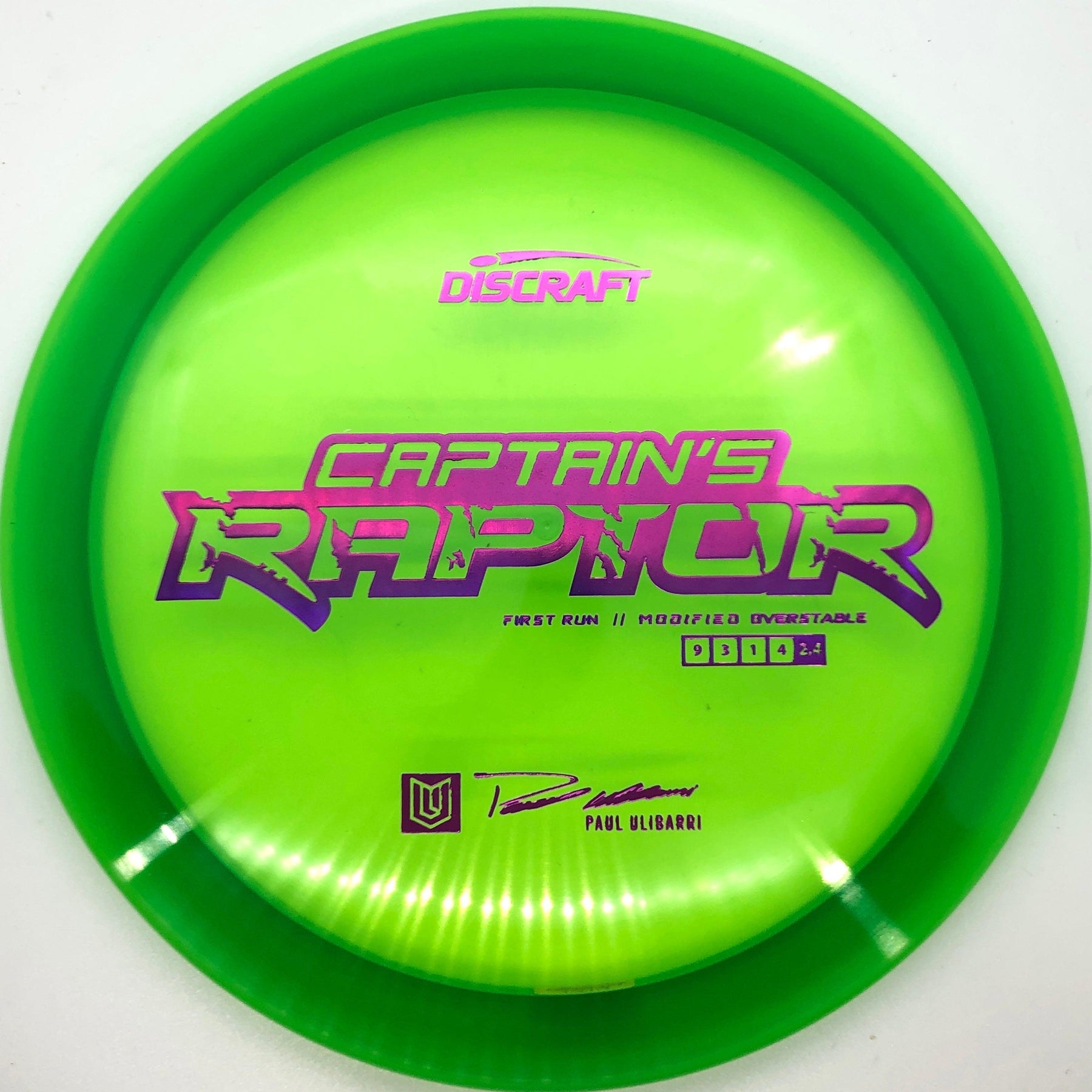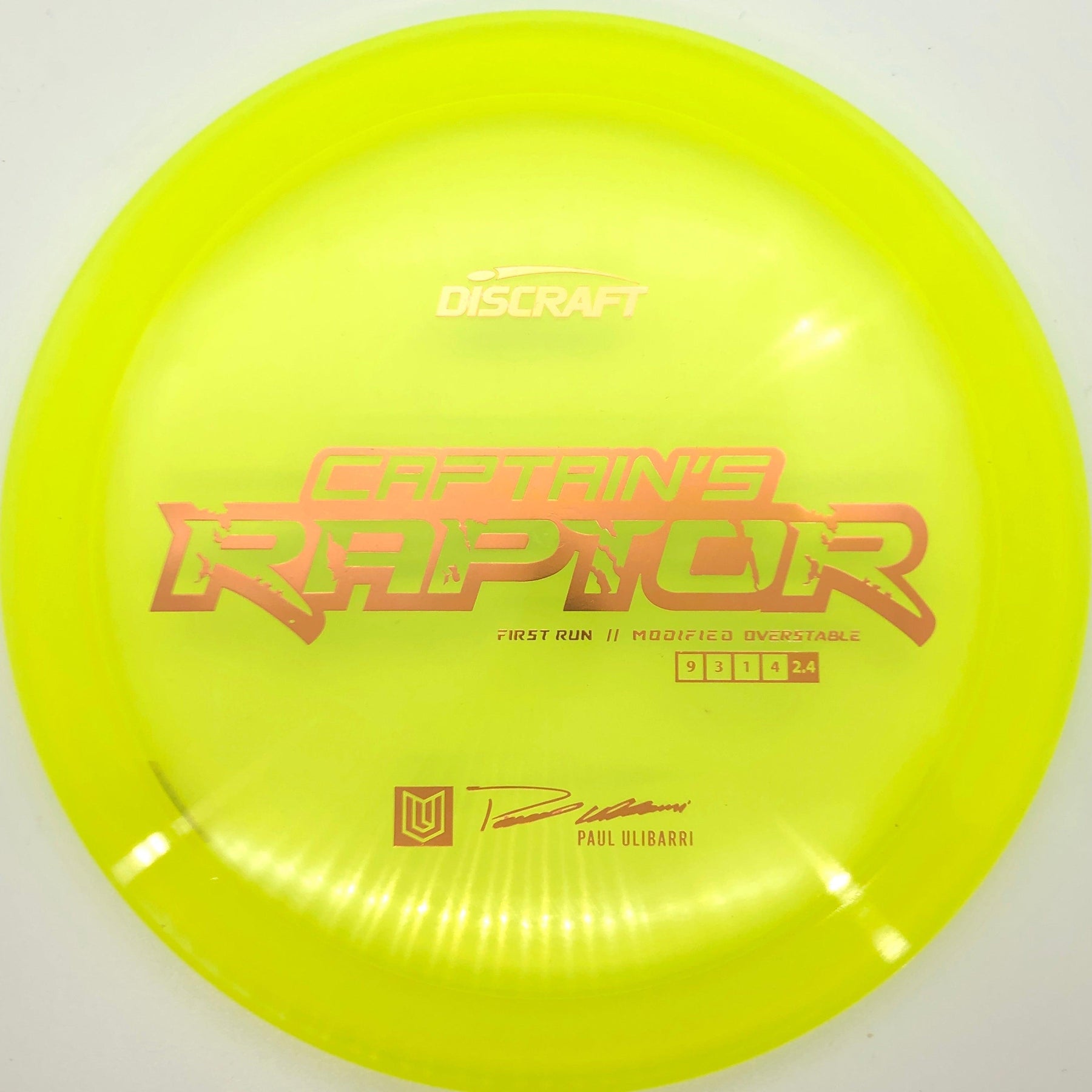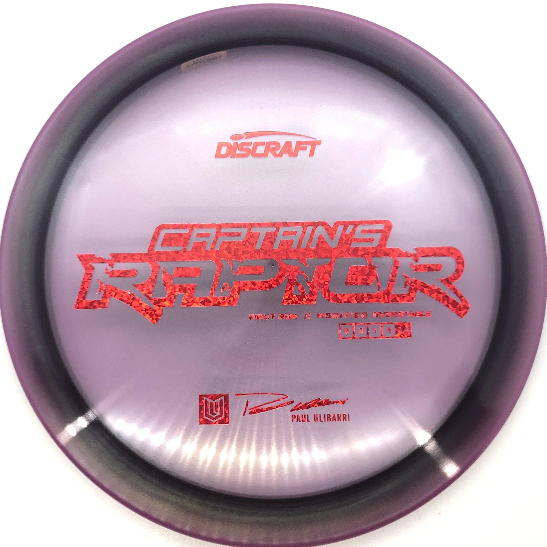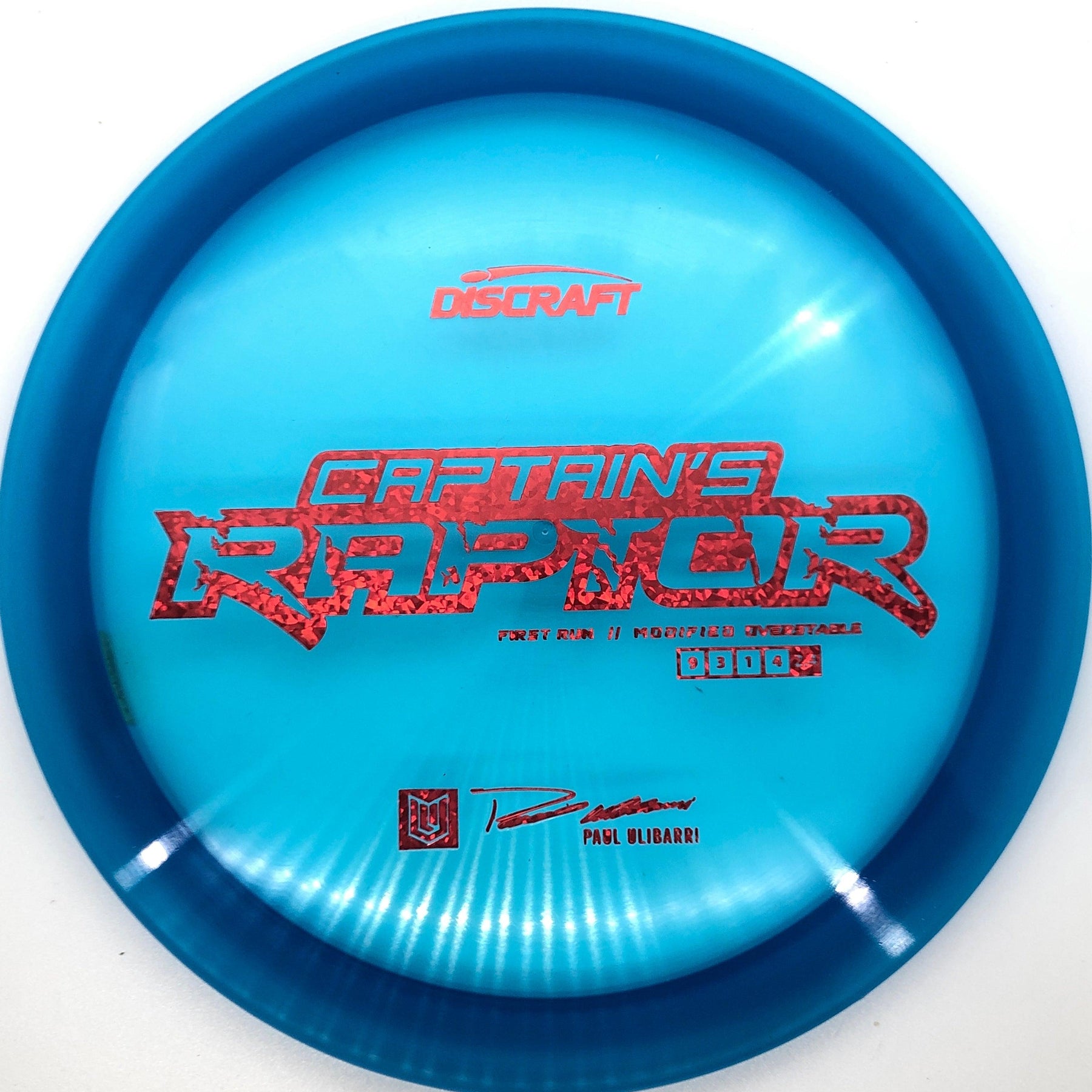 The Captain's Raptor is a modified-overstable Discraft Raptor ran in Special Blend Z plastic. This disc was inspired by Team Discraft Captain, Paul Ulibarri.